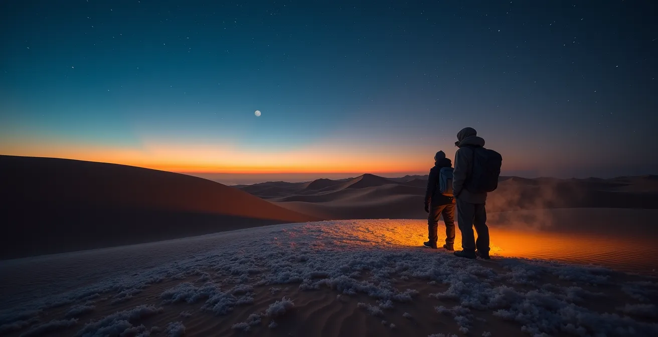Dieser Artikel bricht mit dem Mythos des einfachen „Anziehens“. Er führt Sie in die Logik des proaktiven Thermomanagements ein. Wir werden nicht nur darüber sprechen, was Sie einpacken sollten, sondern wann und warum Sie bestimmte Massnahmen ergreifen müssen. Es geht darum, den Körper zu verstehen und ihn strategisch zu unterstützen, statt nur auf die Kälte zu reagieren. Von der Wissenschaft hinter Merinowolle über Hydrationsprotokolle bis hin zum Schutz Ihrer Kameraausrüstung – Sie lernen, den Temperaturschock zu antizipieren und zu neutralisieren, um Ihre Wüstenerfahrung sicher und unvergesslich zu machen.
